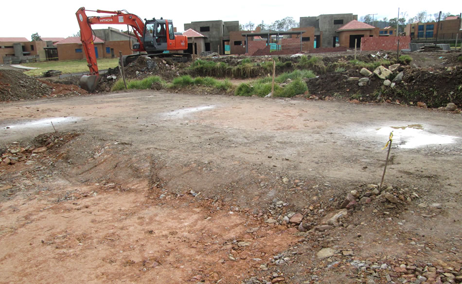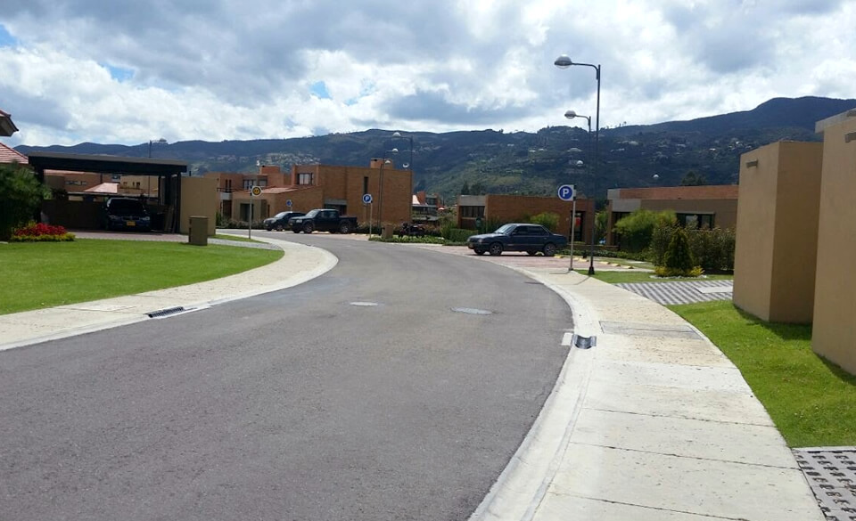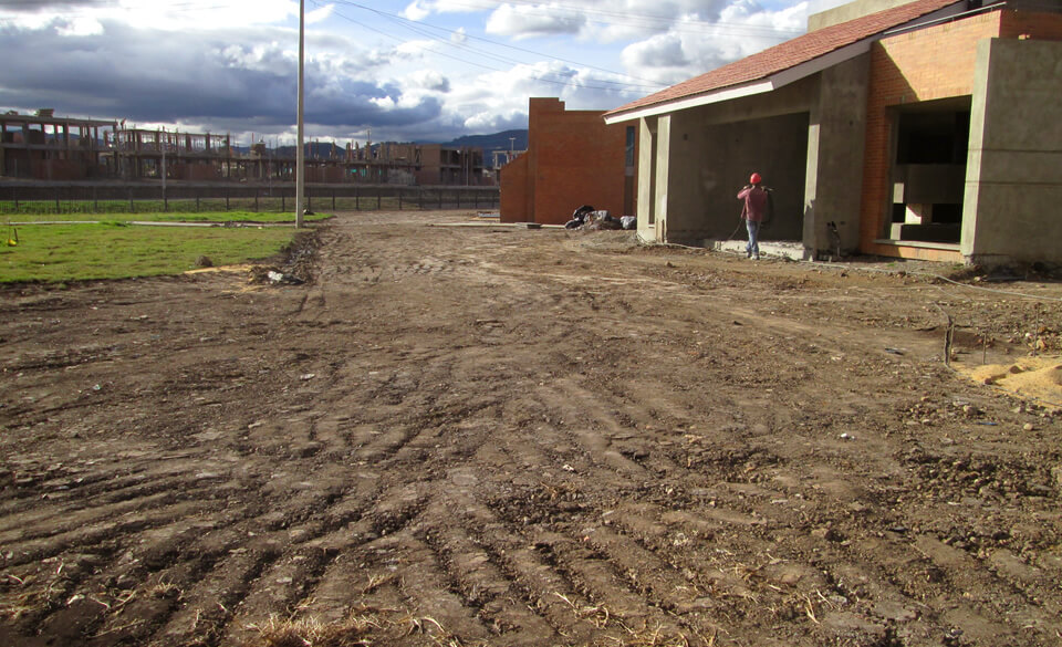Se realizó excavación en vías 1.907m3, mejoramiento subrasante en rajón E aprox. 35cm – 980m3; nivelación y compactación subrasante – 3.124m2, sub base B200 lleno adicional – 163m3, sub base B200 e=35cm – 1.143m3, base B600 e=20cm – 653m3; en andenes excavación – 1.007m3; perfilada y compactación subrasante 2.291m2, sub baseB200 – 1.609m3; excavación a máquina casa parqueadero – 8.903m3; nivelación y compactación subrasante casa y parqueadero – 15.308m2, sub granular B200 – 5.776m3, vol. Recebo anden perimetral – 6.581m3; en zonas verdes excavación – 19.573m3, nivelación y compactación subrasante – 27.453m2, relleno y conformación zonas verdes sector bajo – 19.573m3.